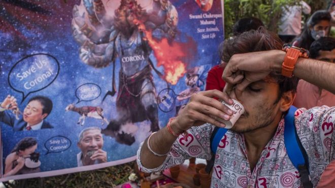 وقال أوم براكاش، القادم من ولاية أُتّر برديش المجاورة للمشاركة في الحفل الديني: “فيروس كورونا هو نوع من البكتيريا، وبول البقر عقار فعّال ضد كل أشكال البكتيريا التي تهاجمنا”.